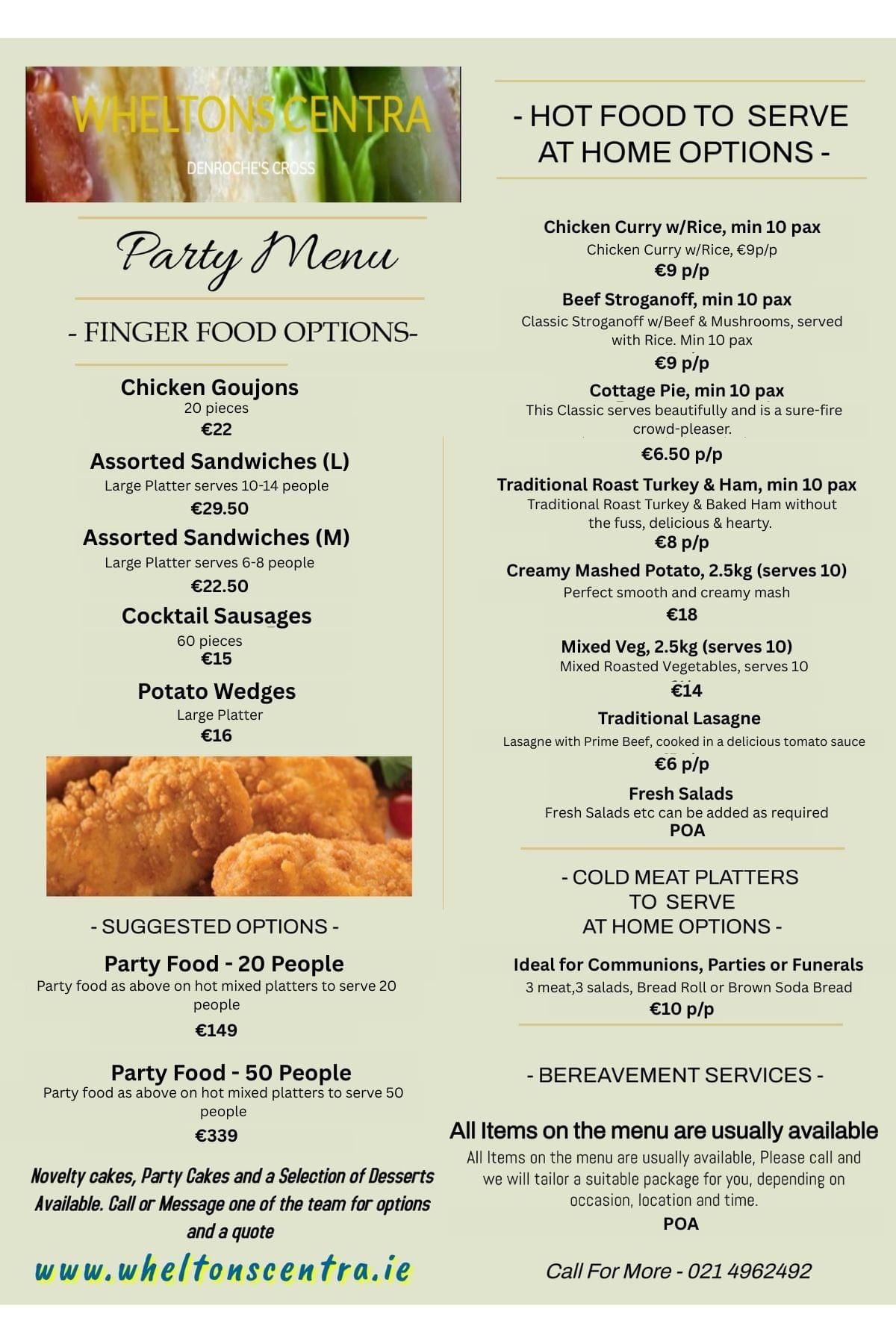 Whelton's Centra is a Retail & Catering Business, located near UCC in Cork. We provide Catering for all small to medium functions from Birthdays, Communions, Meetings and Bereavement Services. As all our food is prepared instore by our Deli Staff, we are the most competitive in the market.